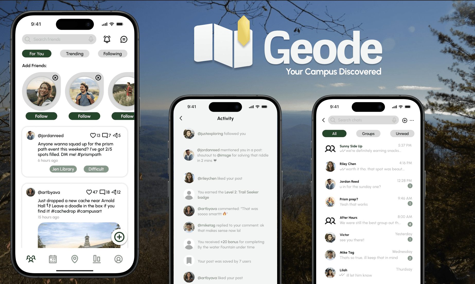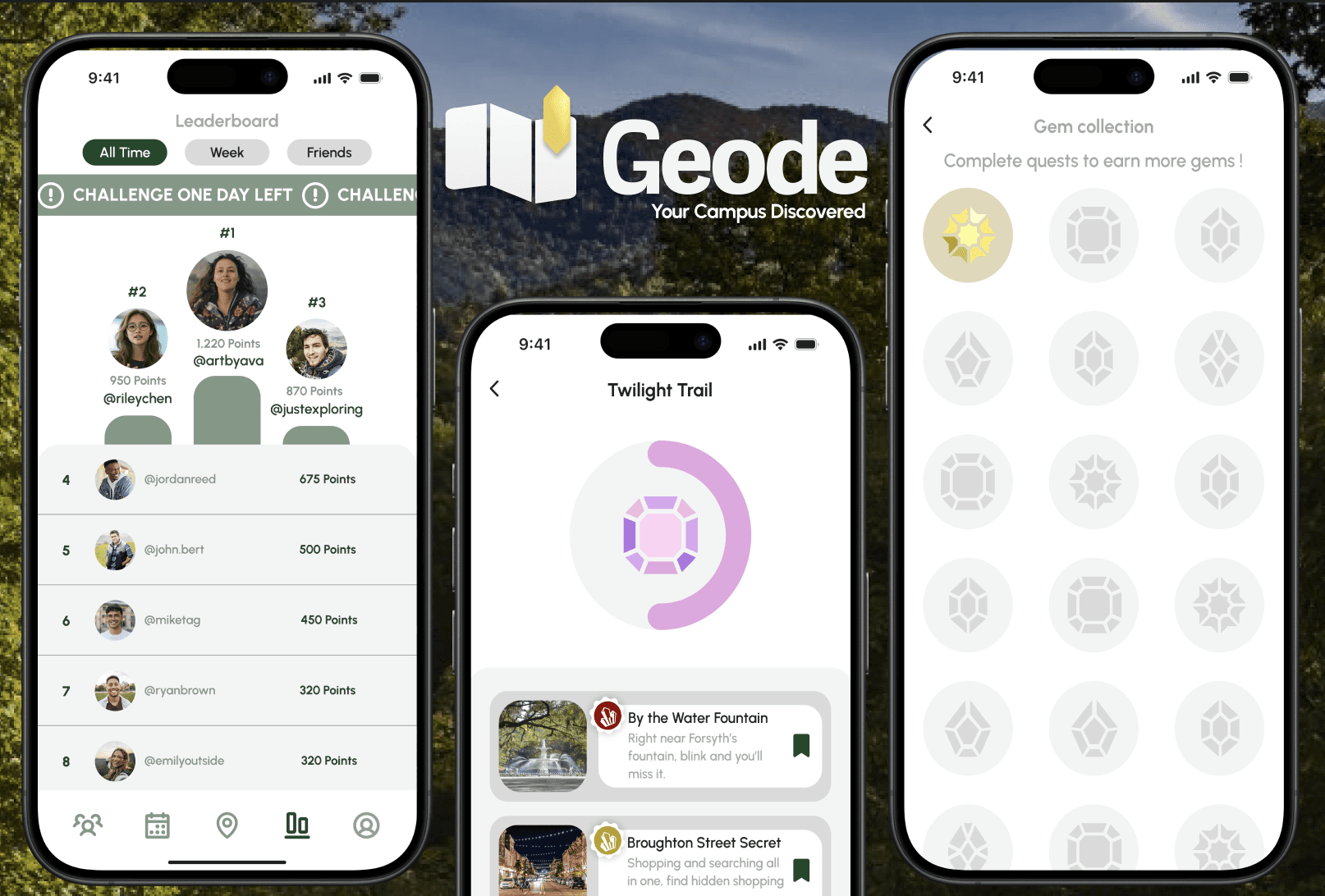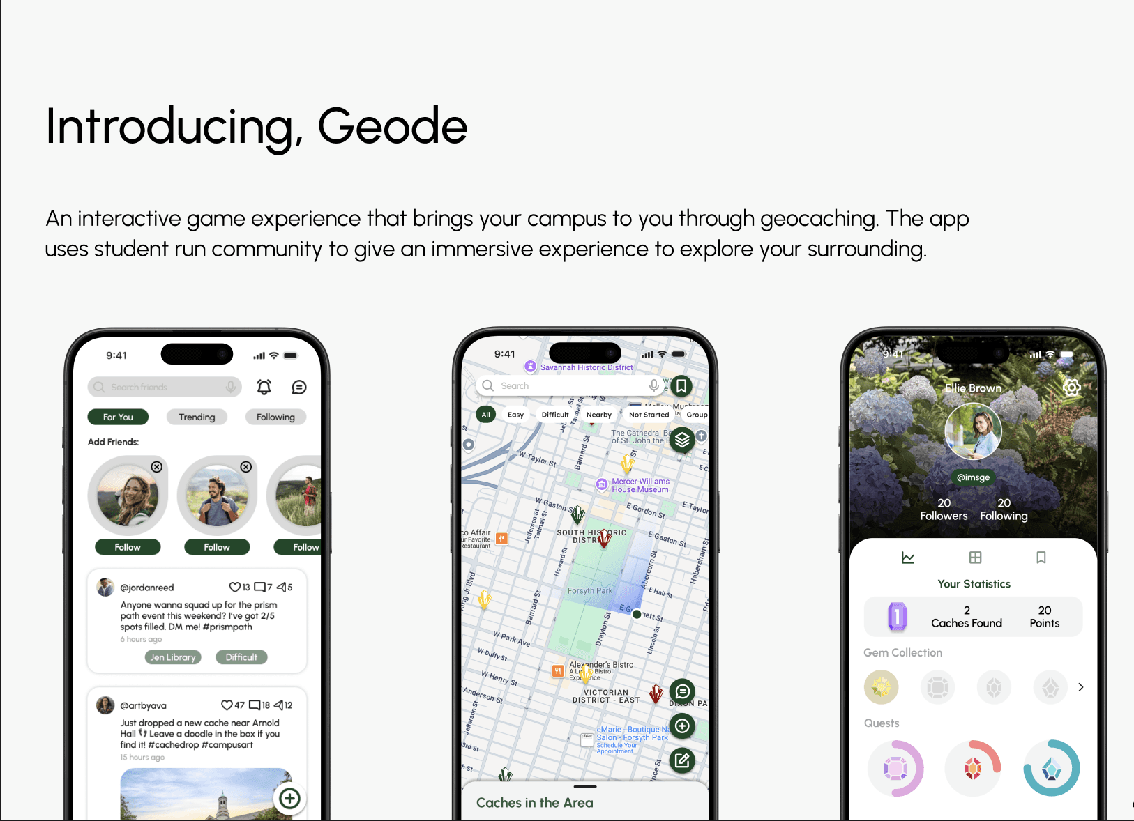 Geode reimagines the campus experience by turning everyday spaces into opportunities for discovery through location-based clues and hidden caches. To drive sustained engagement, we integrated a centralized gamification system featuring short-term challenges with instant rewards and multi-step quests. A built-in points system, badges, and a public leaderboard promote friendly competition among students.